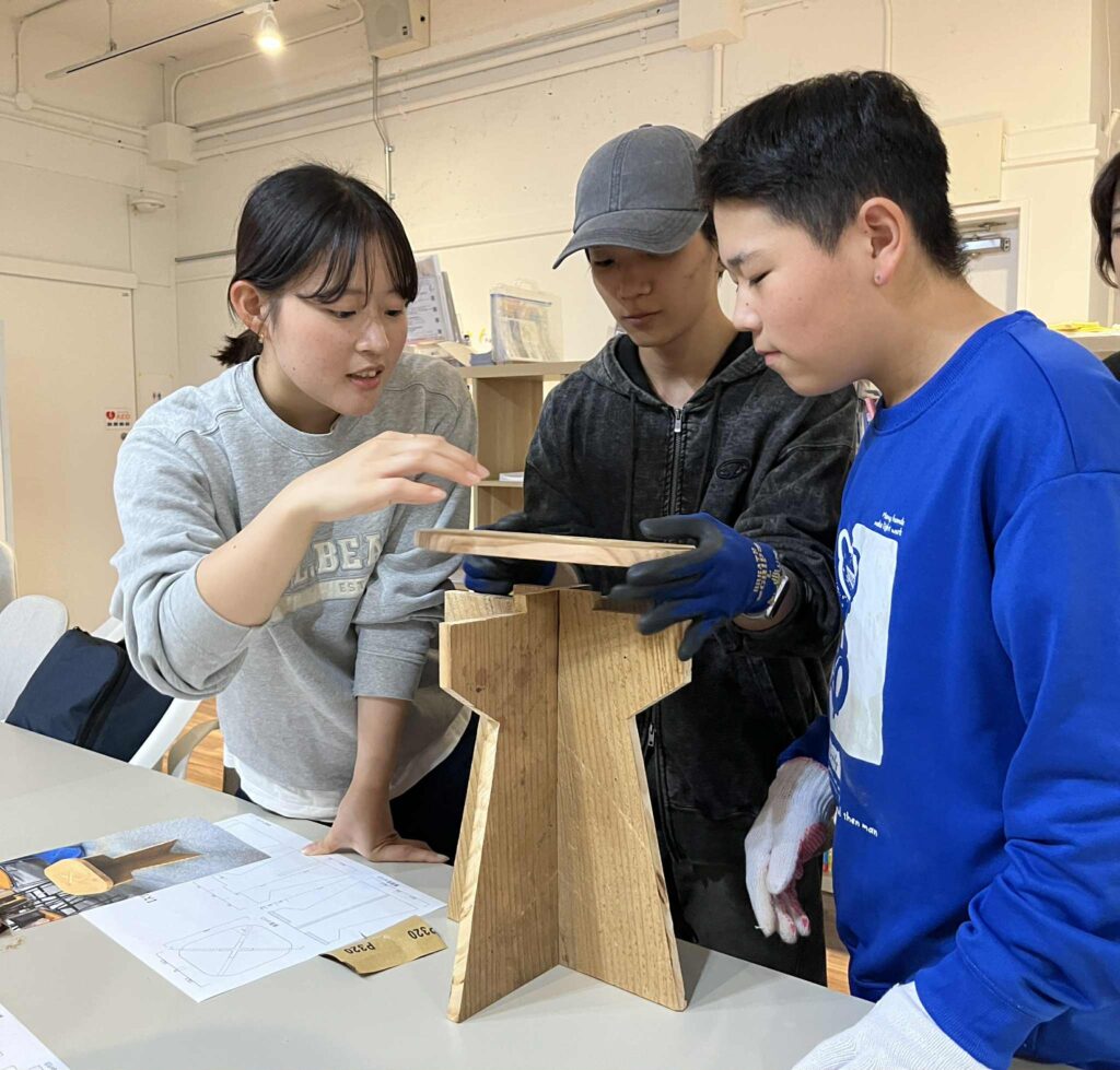 能作文徳さんによる「循環型復興」に関するレクチャーのあと、研究室の大学院生に教わりながら、生徒たちが古材を使ったランプシェードとスツール(椅子)を製作しました。