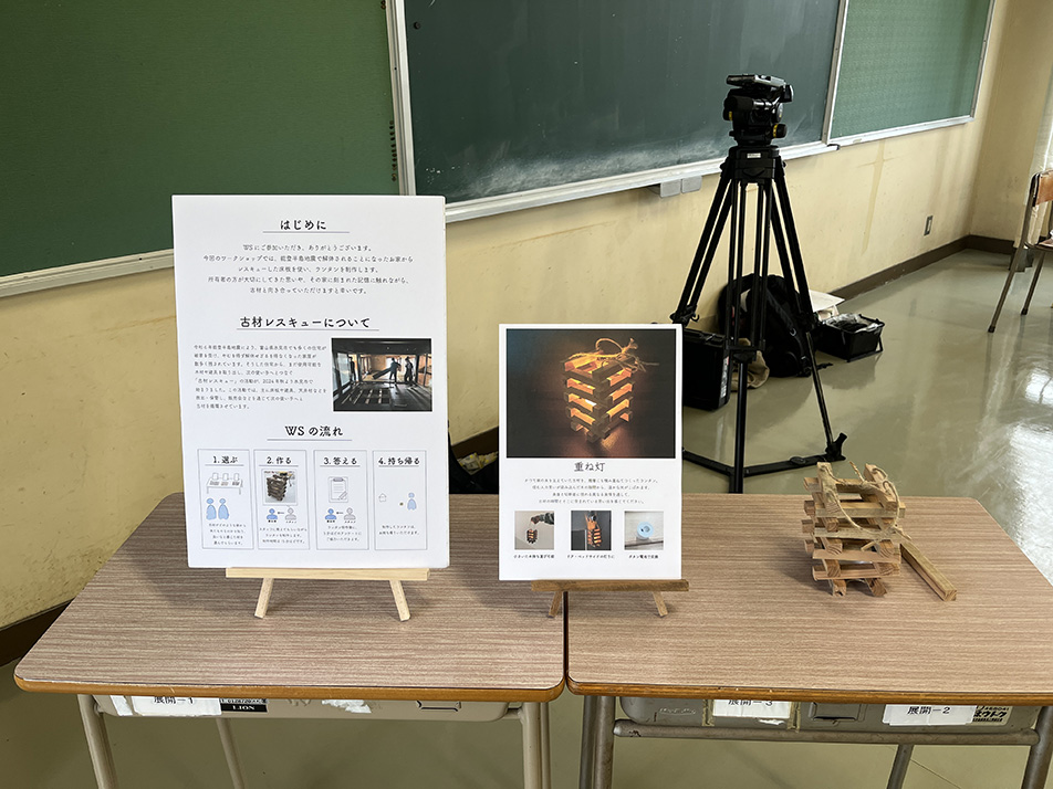 富山大学芸術文化学部で建築を学ぶ籔谷研究室の学生・大学院生が講師役を務め、参加した児童・生徒に古材レスキューの活動内容や解体された家屋の様子、家屋所有者の思い出や気持ちを伝えたあとに、ランタンを製作しました。